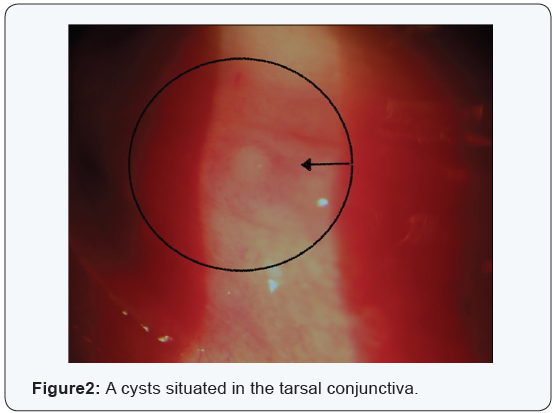 The following day a blood sample was drawn and biomicroscopic examination revealed the presence of a few slow moving larvae. These were removed with forceps. A complete and thorough examination (vision, IOP, anterior chamber, vitreous and fundus) was normal aside from conjunctival injection. An examination two days later showed the presence of cysts situated in the conjunctiva (Figure 2). The base of the cysts was pearl in color but the upper part was transparent. Haemato chemical tests were negative and a diagnosis of ophthalmomyiasis was made based on physical evidence. An examination six days later revealed a slight reduction in the size of the cysts and an absence of larvae. After eight days the cysts were in a phase of regression and the conjunctiva was no longer inflamed.