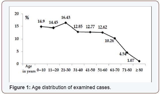 The age distribution of examined cases is shown in Table 1. A comparison between aging subjects to all examined cases (Figure 2) gives us the following information;