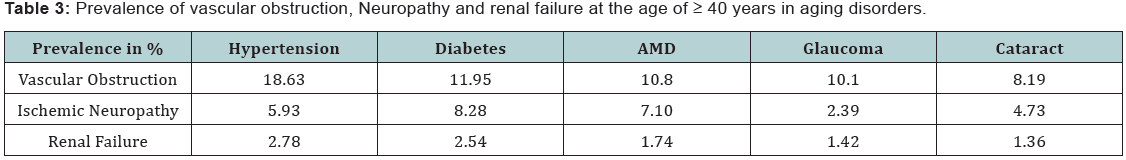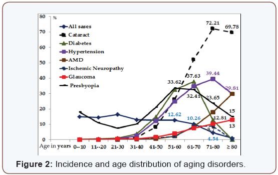 Results:Seven disorders were found to be related to aging; hypertension, glaucoma, cataract, diabetes, age related macular degeneration and ischemic neuropathy, in addition to presbyopia. Hypertension was found to be the leading cause for the development of ischemia and therefore may be the stimulating factor for the development of oxidative stress and oxidation. It shows that basic trends of aging are important while investigating the metabolic disorders at molecular level.
