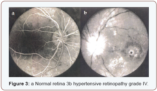 Hypertension increases with age reaching its maximum 39.44% at the age 71-80 years, and then it decreases again. It is known that uncontrolled hypertension causes hypertensive retinopathy. According to its severity, hypertension is classified into four grades (Figure 3) a represents a normal retina.