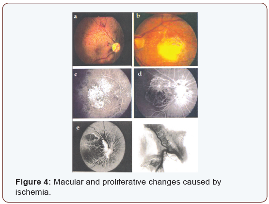 Although it is less common loss of vision in AMD, choroid Neovascularization leading to disc form degeneration produces a more rapid and dramatic and more severe decrease in vision than the atrophic or dry form of AMD. Similar changes were found also among patients in cases of diabetes, AMD, disc form macular degeneration and high myopia, where the clinical appearance of an often round macular scar, that has been recognized to comprise Neovascularization, arising from the chorio-capillaris [10] and proliferative changes at optic nerve head in cases of carotid thrombosis (Figure 4).