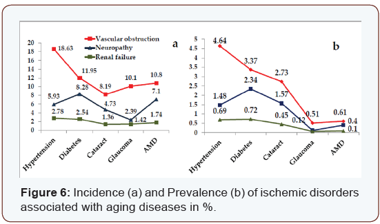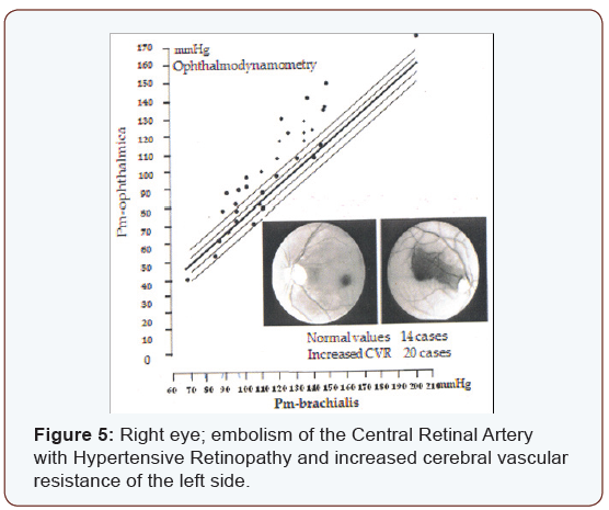 In addition to the genetic and environmental factors, uncontrolled hypertension seems to play a leading role in the development of complications related to aging diseases. 47.1% of all hypertensive patients suffer from Glaucoma, and 92.5% of all diabetics are hypertensive. The incidence of glaucoma in hypertension is relatively high “6.6%” in comparison to 2.28% by all examined cases; the incidence of hypertension by AMD patients is 26.7%. As expected hypertension might cause embolism of the central retinal artery CRA the increased vascular resistance measured by ODM on the (Figure 5).Other side not affected, show increased vascular resistance by 59% of all CRA embolism cases, is an alarming sign that such ischemic changes might occur on the other side or elsewhere in the body. Treatment with antihypertensive drugs is important. The positive expected effect of some anti-hypertensive drugs “decrease blood and intra– ocular pressure” could unlikely elevate the cerebral-vascular resistance and decrease the cerebral blood flow as experienced with clonidine [12,13]. It is therefore expected that patients involved within aging diseases suffer from complications related to hypertension and/or a non-wished side-effect of some antihypertensive drugs causing ischemia. Hypertension seems to be the leading and stimulating factor that causes arteriosclerosis, increased vascular resistance and inability to maintain normal blood flow to the whole body, causing severe damage especially to the very sensitive organs, e.g. stroke, myocardial infarction, gangrene, thrombosis and emboli of the central retina or carotid arteries, ischemic neuropathy and renal failure. It might affect the chorio carcinoma and RPE causing ischemia. It is therefore possible that oxidative stress which plays a major role at the molecular level is initiated by ischemia. One comes in agreement with Newell [14] that these macular changes are related to the decreased blood flow of the chorio carcinoma below the fovea. If this theory is correct, increased blood pressure and decreased Blood flow will produce adequate systemic complications within aging diseases. This could be confirmed by the presence of associated disorders as shown in [Table 3] and (Figure 6 a and b).