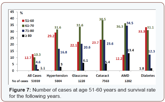 The majority of cases suffering from vascular obstruction are found frequently in hypertension followed by diabetes, AMD, glaucoma and cataract. Ischemic Neuropathy; “ischemic papillitis, retro bulbar neuritis, and other cranial nerves” were found most frequently by diabetics, followed by AMD, in association with hypertension. By calculation the prevalence related to all cases involved in the study, hypertension was found to be the leading disease causing ischemic disorders; Diabetes increases the prevalence of ischemic neuropathy and renal failure. By observing the distribution curve (Figure 2 & 7) one comes to the following life expectation and survival rate of aging diseases. By considering all cases involved in the study independent of age, the survival rate at age 51-60 years was found to be 12.7% and for the age group ≥ 80 years 1.1%. As aging diseases starts to increase by the age of 40 years where the younger population is excluded, it is expected that the survival rate for aging disorders will be different. The prevalence of Cataract, AMD, glaucoma and hypertension continue to increase till the age of 61-70 years. Then the survival rate becomes less. The best survival rate for the age group 71-80 years is for AMD 34.5%, followed by cataract 23.6%, then glaucoma 20.6%, hypertension 16.8% and diabetes 12.3%. The worst survival rate at the age of ≥ 80 years is for diabetics 1.8% and the best was found to be for AMD patients 13.4%. The survival rate of the same aging group for glaucoma 6.1%, cataract 4.1% and hypertension 3% only.