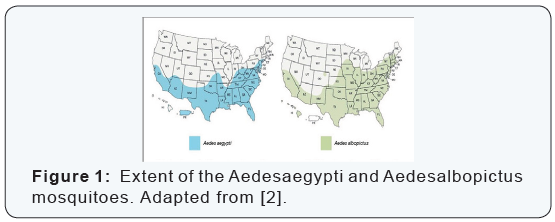From Figure 1, it is clear that only nine of the 49 states shown are free of the Aedesaegypti and Aedesalbopictus mosquitoes. None of the east coast states are free of the Aedes mosquito, even Maine.