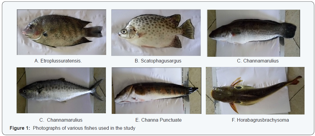 The demand for protein rich food is increasing, especially in developing countries, stimulating the exploration of unexploited or non-traditional resources. Hence, the present work was planned to study the biochemical composition of Etroplussuratensis (Cichlidae), Scatophagusargus (Scatophagidae), Channamarulius (Channidae), Scomberomorusguttatus (Scombridae), Channapunctatus (Channidae), Horabagrusbrachysoma (Bagridae) through estimating their major biochemical components such as total protein and lipid content in the whole body tissue apart from the amino acids, fatty acids profile, vitamins and minerals content (Figure 1A-1F).