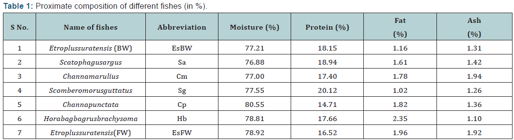 The proximate composition of different fish species are shown below in Table 1. The moisture, crude protein, crude fat and ash content are expressed in % of wet weight basis. The moisture content (%) of different fishes varied from 76.87 to 80.55, crude protein content (%) varied from 14.70 to 20.12, and crude fat content (%) varied from 1.02 to 2.34 and ash content (%) from 1.09 to 1.93. The highest value of crude protein was found in marine fish (Scomberomorusguttatus) and lowest protein content was reported in fresh water fish (Channapunctata). In terms of crude fat, the highest value was recorded in Horabagrusbrachysoma whereas lowest value was in Scomberomorusguttatus. Nutritional point of view, marine fish and brackish water fishes are good source of crude protein compare to fresh water counterparts. Similar results related to proximate composition of fresh fish were observed by [13].