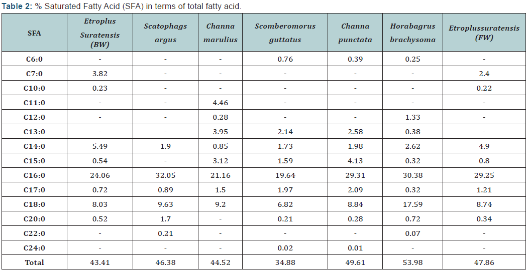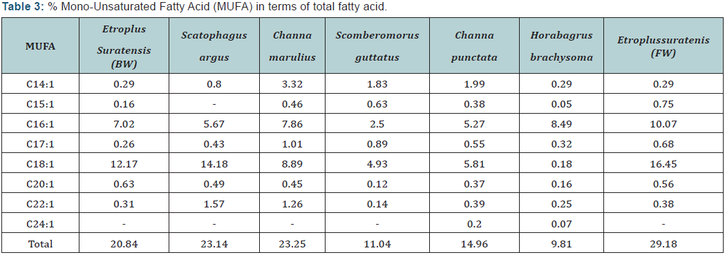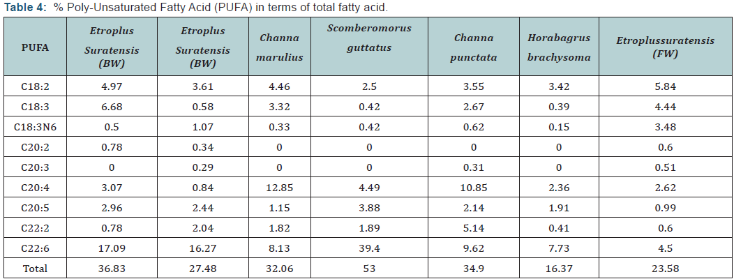 The fatty acid profiles of different species are shown in Table 2. The predominant fatty acid among all fish species was Palmitic acid (C16: 0) which varied from 19.64 (scomberomorusguttatus) to 32.05 (scatophagusargus). EPA and DHA content was found to be higher in marine water and brackish water fish with highest amount was recorded in Scomberomorusguttatus of about 3.88 and 39.4 respectively. The lowest EPA and DHA were encountered in Etroplussuratensis (cultured), of about 0.99 and 4.4 respectively. The PUFA content especially EPA and DHA were predominant in marine fish than fresh water fish counterparts. This may be due to fish residing in marine water have great food chain (marine algae) which are rich in HUFA content.