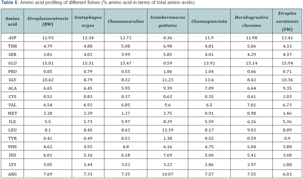 The sequence of amino acids in a protein or peptide determines the properties of the molecule. Amino acid present in muscle tissue was detected using HPLC. The chromatogram of sample is compared with the retention time of standard. The HPLC method for the detection of amino acids has been shown to be capable of measuring various types of biological molecules in a sensitive, accurate, and comprehensive fashion. Muscle tissue of fish is an important source of protein for humans. The amino acid composition is one of the most important nutritional qualities of protein and the amino acid score [14] and is used to evaluate protein quality world-wide [15]. Comparative amino acid profile (% amino acid in terms of total amino acid) of the muscle tissue of different fish is represented in (Table 3).
