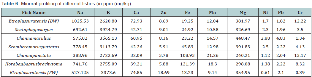 The cells also require Mg for cell division and enzyme production. Calcium is major constituent of the inorganic portion of the diet and function primarily as the structural component of hard tissues viz. bone, exoskeleton, scales and teeth. In addition to its structural function Calcium is essential for blood clotting, muscle function, proper nerve impulse transmission, osmo regulation and as a cofactor for enzymatic process. Iron (Fe) were present in considerable amount in all fishes with higher amount in Horabagbagrusbrachysoma 121.39) and lower in Etroplussuratensis (FW) of about 13.23. Fish is a major source of Fe for adults and children, and is a vital mineral for better health, especially for women. Notably the highest chromium (12.22) amount was found in Etroplussuratensis (BW) whereas least amount was recorded in Etroplussuratensis (FW).