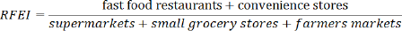A basic condition for healthy and fair urban living depends on the food environment I [3]; it can be described through: the location of retail outlets in a community; the range and types of foods available to consumers; the information provided to consumers about foods; and organizational structures which affect food access and availability (such as retail networks). Public health problems resulting from poor diet are tightly linked to the food environment found in a community. The eating behaviours- and the likelihood of being obese - are influenced by what’s readily available in the community. Retail food outlets that sell affordable, high quality, nutritious foods can encourage a healthy diet, reducing an individual's risk for chronic diseases, including obesity and diabetes. Higher RFEI (Retail Food Environment Index) has been shown to be correlated with increased obesity in the USA and around the world.