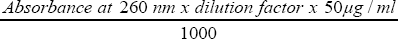 E stimati on of the quality and quantity of the extracted genomic DNA by UV spectrophotometry: For spectrophotometric analysis, 2μl of DNA samples was diluted to 100μl with T.E. buffer and 100μl of the blank solution were prepared. The spectrophotometer readings was recorded, the blank sample was read in the machine first, the DNA samples diluted in T. E. buffer was recorded at 260nm/280nm using Spectophotometry (UV absorbance) at 260nm and 280nm, using U.V Spectophotometer (Lab Kit model ST-UV 755B). DNA concentration was calculated using absorbance values at 260 nm using the following formula [23].