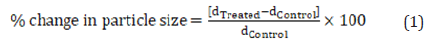 The percent change in particle size (d) for at below 10% level (d10), 50% level (d50), 90% level (d90), and D (4,3) was calculated using the following equation 1: