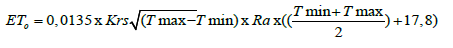 In many regions, in particular in Africa, there are no consistent climatic data and, often, only maximum and minimum temperatures are obtained. Under these conditions, it is not possible to use the Penman-Monteith method, so more simplified ones should be used, such as the Hargreaves-Samani method. This method is widely used for irrigation management in situations with little available meteorological data [4]. According to Shahidian et. al, [5]. The Hargreaves-Samani equation has been used a lot by other authors and in several regions and with good results namely: