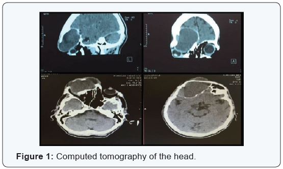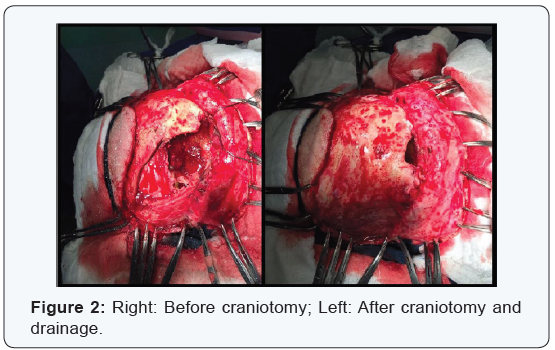 Other findings were significant right orbital deformity with compression and infero-lateral deviation of the right eye with grade I proptosis (Figure 1). The preoperative differential diagnoses were right frontal sinus mucocele, right craniofacial neoplasm and mucopyocele. The surgical plan consisted of an bicoronal incision to allow ample surgical exploration of the mass. Intraoperatively, the findings included right frontal bone erosion expanding all the way into the right orbital roof with a non-septated, mucoid green fluid collection. Following the right orbital craniotomy, it was observed that the collection extended intracranially, with a fibroid capsule adhered to the meninges and septated epidural empyema (Figure 2).