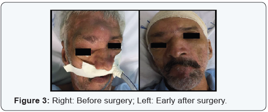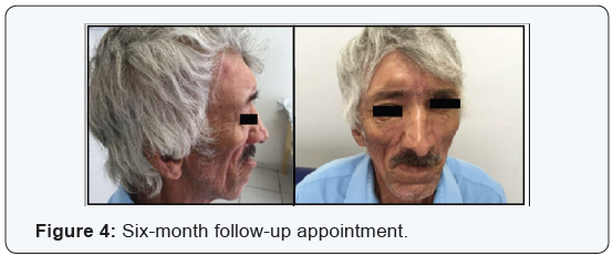 The clinical history, physical examination, imaging and histopathology findings confirmed the diagnosis of unilateral right frontal sinus mucocele with intracranial extension. On postoperative follow-up the patient did not present any further complaints of headache, had a marked improvement of the orbital deformities, proptosis and diplopia. No relapse was identified up to the six-month follow-up appointment (Figure 4). We opted for a bicoronal open access technique to surgically remove the mucocele and reconstruct the frontal bone with good aesthetic results and protection of brain tissue as previously described in the literature [1,11-13]. Cranial bones infection can be hematogeous (blood-borne pathogens), however the majority of cases are caused by contiguous infected tissues and can extend to the meninges and adjacent soft tissues [12,14-17]. The patient in this case-report received 4 weeks of antibiotics without surgical site infections during the follow-up.