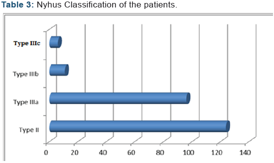 A total of 237 patients underwent inguinal hernia repair during the study period. The median age of the geriatric patients were 72 (range, 66-93). Of the study group, 153 (% 64.5) patients underwent surgery under RA and 84 (%35.5) patients under GA. The patient’s characteristics and anesthetic technique are summarized in (Table 1). The majority of the patients were ASA grade I and II (% 96.2) with ASA grade 3 patients accounting for % 3.8 of all patients (Table 2). According to the Nyhus classification, 124 patients were type II, 96 type III a, 11 type III b and 6 type III c (Table 3). Treatment was 158 with mesh techniques (Lichtenstein and mesh plug), 79 with suture technique (modified Bassini) (Table 1). Although most of the patients were successfully discharged next day, only 9 of them required the other day because of hematoma, seroma and scrotal edema. Hospitalization rate was 1.07/day. There were no deaths or major complications in the group. Mean operation time was 46 min (32-105 min) in the general anesthesia group. Mean operation time was 65 min (40-135 min) in the general anesthesia group.