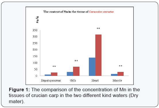 The contents of Mn in fish tissues compared between unpolluted native water and coal gangue polluted water has been shown in Figure 1. The content of Mn in hepatopancreas, gills, hearts and muscles of fish in polluted water were all extremely higher than native water.