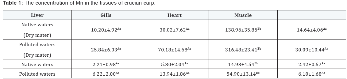 The results, comparing the contents in different tissues has been shown in Table 1. In the unpolluted native waters, the content of Mn in heart was significant higher than hepatopancreas, gills and muscles. In coal gangue polluted water, the content of Mn in heart was extremely higher than the hepatopancreas, gills and muscles.