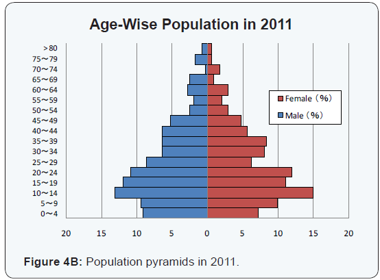 The demographic changes in the targeted village can be shown in its age structure. Figure 4A and 4B indicated population pyramids in 2001 and 2011, respectively. In comparison with the different years among 1981, 1991, 2001 and 2011, the former three periods commonly indicated that the village had the largest number of the youngest age group (0 to 5 years), with many young people and few elderly, shaping the category of population pyramid as shown in Figure 4A. It is estimated that the proportion of the village population under age 19 accounted for more than half the population. On the other hand, the highest proportion of the age group in 2011 was ages 10-14 (27.9%), followed by ages 15-19 (23.0%), ages 20-24 (22.9%), ages 5-9 (18.9%), ages 0-4 (16.2%), etc. As the years pass, the population shape is changing from triangular to barrel-like. Given that the majority of age group was ages 10-14 in 2011, the increased growth rate of village population will be steadily continued to a great extent for the time being.