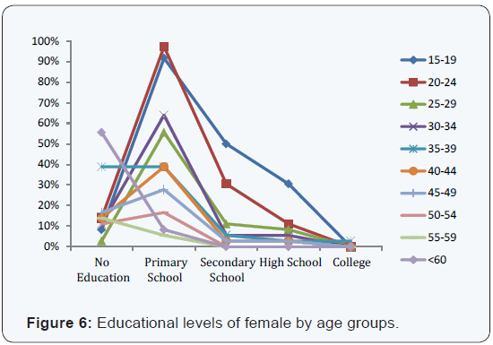 The estimated population numbers from 1981 to 2011 were largely determined by two demographic factors (fertility and mortality) in the targeted village. In the former, Figure 5 indicated the trend of total fertility rate (TFR) by three decadal periods (1981-1990, 1991-2000, 2001-2010). TFR is a measure of the anticipated level of completed fertility per woman if she were to pass through the reproductive years bearing children. Looking at the changes in Figure 5, it is clear that the trend of TFR has been toward a steady decline. The TFR during the period from 1981 to 1990 was 4.35, which was the highest one, followed by 1991- 2000 (3.92) and 2001 to 2010 (2.48). The TFR in the rural area of Odisha state, India was 2.4 [22], largely corresponding to the survey result. By age group (5-year-cohort), ages 25-29 was the highest proportion of fertility rate (1.54) in 1981-1990, followed by ages 20-24 (1.37), ages 30-34 (0.89) etc. On the other hand, ages 20-24 was the highest proportion of fertility rate in 1991- 2000 (1.51) and 2001-2010 (1.35), respectively. The average age of first marriage was 18.1 for female and 22.5 for male while 19.4 in 1981-1990, 19.2 in 1991-2000 and 19.9 in 2001-2010. A oneway analysis of variance yielded a main effect for gender [F (1, 393) = 259.40, p < .01]. Furthermore, it indicated a main effect for periods in the case of female [F (2, 263) = 7.76, p < .01], so that post hoc analyses using the Tukey HSD test indicated that the average age of first marriage for female was significantly higher in 2001-2010 (p < .05) than in the other periods (1981-1990 and 1991-2000), though there were no statistically significant differences among them for male [F (2,126) = 0.89, p > .05]. It is likely that the increase in age of marriage for female might be linked to improvement of educational status as well as their economic condition. Although 30% female who were more than 15 years old had no educational background in 2011, younger females (particularly ages 15-19) got more opportunities for entering primary (1st t o 5th grade), secondary (6th to 7th grade) and high schools (8th to 10th grade) than older ones did as shown in Figure 6. Their educational attainment affecting childbearing through various factors including age at marriage, breast feeding, post-partum abstinence, child mortality etc. [23] might have an effect on fertility in 2001-2010.