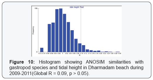 Similarity of polychaetes, amphipods and gastropods were observed with tide height to discern their significance level with different tidal height. Gastropods from Dharmadam beach showed no significant segregation with tide height (R = 0.09, p> 0.05) (Figure 10). Amphipods from Fort Cochin beach also demonstrated that there was no significant segregation with tidal height (R=0.04, p > 0.05) as per ANOSIM analysis (Figure 11). Polychaetes from both the beaches were also observed and in both Fort Cochin and Dharmadam beaches the polychaetes illustrated no significant segregation with tidal height (R = 0.02, p > 0.05 and R = -0.067, p > 0.05) (Figures 12 & 13). All the R values observed were close to zero, as per Clarke et al. [13], R values close to zero implying no segregation between samples. The significance level observed were also higher than alpha significance value (0.05), indicating no significance between samples.