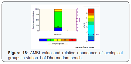 In Dharmadam beach (station 1) AMBI index explained dominance of group 2 organisms. According to the classification the group 2 organisms are species unresponsive to enrichment and variation is less with time. The AMBI value was 1.491, it is coming under slightly disturbed nature with good ecological status according to the classification. An unbalanced community health was observed in station 1 (Figure 16) and the value from 1.2-3.2 is considered as slightly polluted. In station 2, organisms were coming under group 2 and AMBI value was 1.545, subsequently it was classified under slightly disturbed with good ecological status (Figure 17).