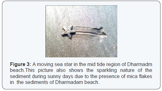 Avian fauna were also observed from both the beaches and it was observed that eagles and crows were common in both the beaches and sea gulls and king fisher’s were observed occasionally at Dharmadam beach. The honey comb like structures of sand, underneath the rocks were also another attraction of Dharmadam beach. These are made by sand castle worms and these sandy formations are very delicate. Sand castle worms are abundant in low tide region and they are exposed only in lowest low tides (Figure 4).