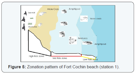 Ripple formation was a common feature in Dharmadam beach. According to Chakrabarti [15] energy levels of waves and currents of intertidal region exert strong control on ripple formation patterns. In Dharmadam ripple formation was observed in almost all the months during the sampling, however in Fort Cochin it was totally absent. The ripple observed was somewhat symmetrical and formed as a result of back and forth motion of wave action. The upper crest of the ripple was not so straight. Tidal channel is also a permanent feature in Dharmadam beach and it is important for the birds and marine larval forms. The channel observed to be deep in monsoon season due to high influx of water and shallow during pre and post-monsoon season. Laterite rock formation of Dharmadam beach also gives numerous micro habitats to the epifauna as it has lot of holes on rocks and small tide pools. The iron oxide rich laterite rocks are frail and change in shape and position was also observed seasonally during the study. Weathering of rocks may increase due to intense wave action of rocky areas.