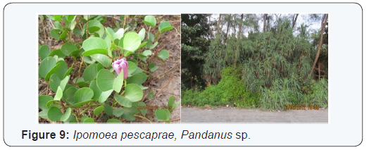 Both the beaches have shore vegetation near to the shore line and Dharmadam beach embraces variety of flora when compared to Fort Cochin beach. Vegetation on the beach plays a significant role in beach stabilization, erosion and prevention. The major plants observed from the Dharmadam beach were coconut trees (Coccos nucifera), Pandanus sp, Casuarina sp, beach morning glory or rail road vine (Ipomoea pescaprae) (Figure 9), mangroves, almond tree (Badam) etc. A small forest of Casuarina spi. is also present in the shore line of the Dharmadam beach. At Fort Cochin the major plants observed were coconut trees (Coccos nucifera), May flower tree or gulmohar (Delonix regia), Jarul (Lagerstroemia speciosa), banyan tree (Ficus bengalensis), rail road vines (Ipomoea pescaprae) etc.