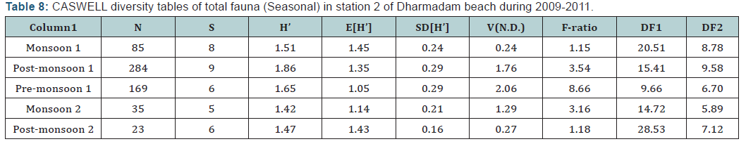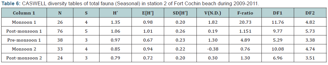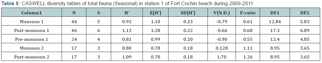 In Fort Cochin beach (Station 1), seasonal diversity index showed highest diversity in post- monsoon season, 2009 (Postmonsoon 1) (H’= 1.13) with high species richness (d=1.3). Species evenness was observed high in post-monsoon season, 2010 (post-monsoon 2) (j’= 0.99) with lesser dominance of species (λ’= 0.33). Lesser diversity was observed in monsoon season, 2010 (Monsoon 2) (H’=0.80) (Table 1).