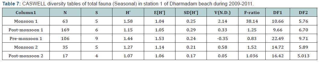 Seasonal diversity index showed higher diversity in Monsoon, 2009 (Monsoon 1) Dharmadam beach (station 1) (H’=1.58) with low dominance of species (λ’ = 0.20). Premonsoon season, 2010 showed higher species richness (d=1.71) and higher species evenness was shown in monsoon season, 2009 (Monsoon 1) (j’=0.98). Higher dominance was observed in post-monsoon season, 2009 (Post-monsoon 1) (λ’= 0.42) with uneven distribution (j’= 0.64). A decreasing trend of diversity was observed from season to season (monsoon, 2009 to postmonsoon, 2010) (Table 3).