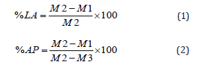 X-ray diffraction was applied to verify crystallinity using a Bruker D8 Discovery Instrument X-ray diffratometer (CuKa radiation, 2θ diffraction). Mechanical compression was performed using a TIME GROUP 30 KN equipment, with load cells of 5-ton, speed of 0.5 mm/minute. The total porosity was calculated based on the Archimedes method (NBR ISO 5017:2015) [10]. Briefly, samples were dried at 60°C for 24h. After dried, samples were weighted and recorded as M1. Samples were then placed in a beaker containing ethanol. Deaeration cycles were applied to complete absorption of ethanol inside the samples. After complete ethanol immersion, the weight was measured and recorded as M2. Finally, the immersed sample was weighted and recorded (M3) using mechanical analytical balance. The % of liquid absorption (%LA) was calculated using equation I and the % of apparent porosity (%AP) using equation II.