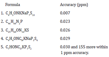 All 5 species are potential formula based on the accuracy of the FT-ICR-MS instrument employed. Therefore, we generally need to use, in addition to the gross mass, the isotope ratios. Using the natural abundance of 1.1 % of 13C, the intensity ratio of the 13C/12C peaks in the mass spectrum yields the number of carbon atoms in the species, and when the calculated ratio cannot be determined sufficiently accurate it at least excludes several possible formulae. For chlorine, the natural abundance is 24% for 37Cl versus 35Cl, so the ratio of those peaks in the mass spectrum will immediately indicate whether formula 2 is either to be excluded or the correct hit. With 34S having an abundance of approximately 4% compared to 32S, the five-formula presented, and the various isotope ratios revealed that the number 1, C12H25O6N2S, is the correct chemical formula for the species detected. This one happens to have the smallest deviation from the theoretical mass of all five potential species, -0.016 ppm, but that is just a coincidence and not the reason for the correct assignment.