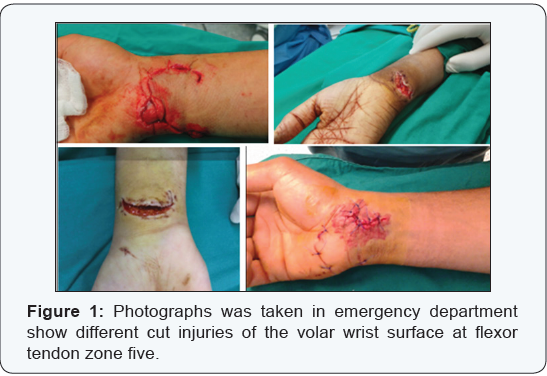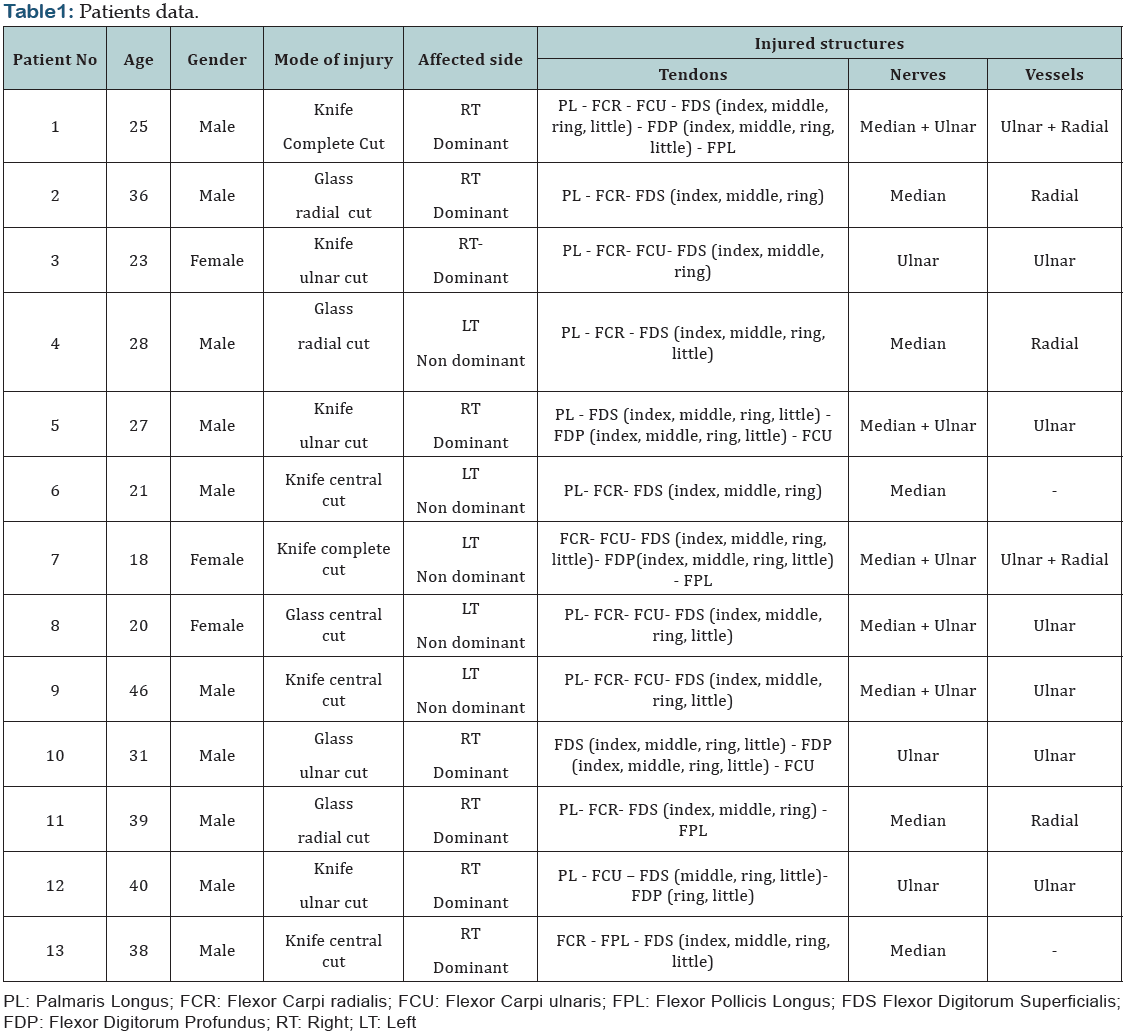 Hand injuries are common and account for 5-10% of emergency department (ED) injuries and 4.7% of all trauma patients [1]. Various mechanisms of injury can lead to volar wrist injuries, and the most common are; machine injuries, glass lacerations, knife wounds, and suicide attempts [2]. Flexor Zone five extends from distal wrist crease to the flexor musculotendinous junction as described by Verdan in 1959 [3].This is the most exposed and so the most vulnerable zone for injuries. Extensive injuries to flexor tendons and surrounding structures are sometimes referred to as spaghetti wrist [4]. The functional importance of the closely packed structures, blood vessels, nerves and flexor tendons, makes the injuries in this zone very hazardous and the carful management of paramount importance [5,6]. The aim of this study was to determine the clinical outcome for early repair and programmed rehabilitation of acute cut injuries in Flexor Zone five. Also to evaluate of the efficacy of multidisciplinary team in evaluation and management of acute volar wrist injuries.