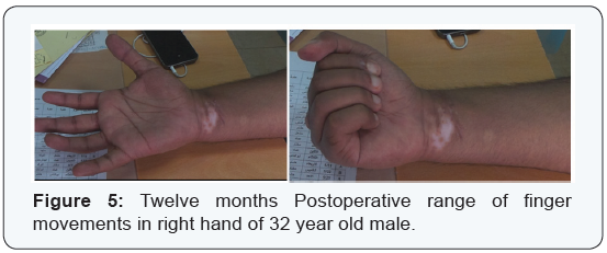 Postoperative physiotherapy rehabilitation program was started after 24 hours under supervision of specialist in physical medicine rheumatology and rehabilitation removing the splint during physiotherapy, initially with active extension and controlled passive flexion and passive range of motion exercises. After two weeks activity was progressed to placing objects but not holding and after 4 weeks holding objects but not exerting force. After 6 weeks holding and lifting light weights was allowed with progressively increasing resistance to flexion. After 6 weeks splint was worn only at night for another 2 weeks (Figures 4 & 5). Progressively increased activity was allowed from 8 weeks onwards. Patients were followed-up with evaluation of: