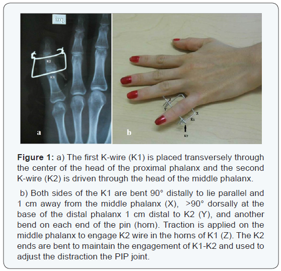 Both sides of the K1 are left long enough so the ends can be bent 90° distally to lie parallel and 1 cm away from the middle phalanx (X) (Figure 1b). Two more bends are applied to the proximal phalanx wire (K1): a dorsal bend (90°) at the base of the distal phalanx approximately 1 cm distal to K2 (Y) (Figure 1b) and another bend on each end of the pin (horn). Traction is applied on the middle phalanx to engage K2 wire in the horns of K1 (Z) of the proximal phalanx (K1) wire, achieving the desired skeletal traction. The K2 ends are bent to maintain the engagement of K1-K2 and used to adjust the distraction the PIP joint (Figure 1b).