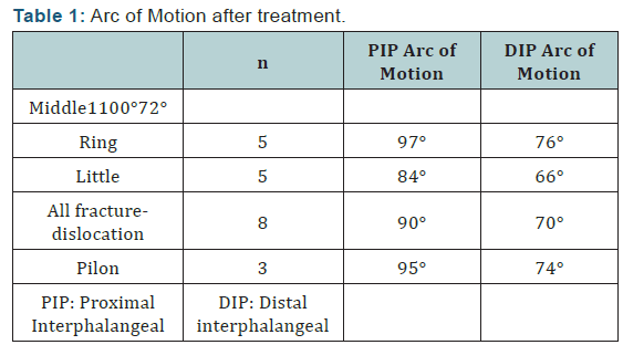 The patients who demonstrated the greatest motion with the fixator in place often demonstrated osteolysis around the proximal phalanx axis pin. This can be attributed to the mechanical effect of motion around the pin and was resolved in every case after removal of the fixator.Although differences were noted in final motion based on the finger involved or type of injury (better results middle/ring vs. little finger, and pilon vs. fracture-dislocation type) this study has some weaknesses including small patient cohort and the short length of follow-up.