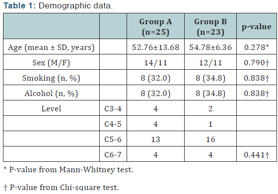 Total of 48 cases were included in the study. 25 cases used conventional plate with cage insertion (group A) and 23 cases used zero-profile plate (group B) for cervical interbody fusion. The demographic data of both groups are descripted on (Table 1). All factors mentioned above showed no statistically significant difference between the 2 groups. Cases’ clinical improvements were graded according to Odom’s criteria: