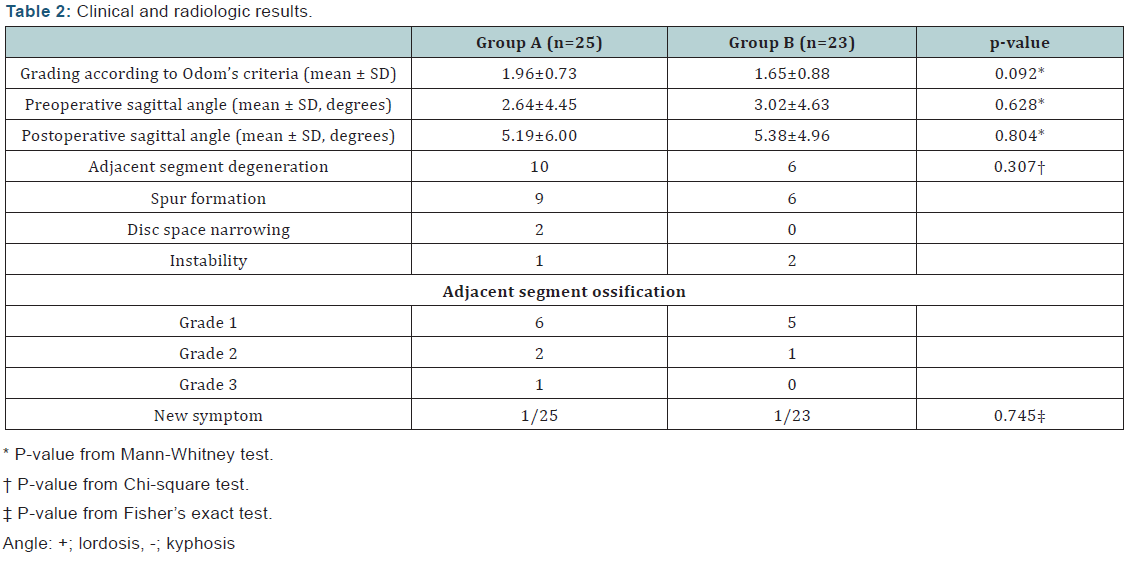 Results: Adjacent segment degeneration was present in 10 cases in group A and 6 cases in group B. The occurrence of the degeneration was statistically insignificant. In aspect of grade of ossification, group A consisted of 6 cases of grade 1, 2 cases of grade 2, and 1 case of grade 3 while group B consisted of 5 cases of grade 1, 1 case of grade 2, and no case of grade 3.