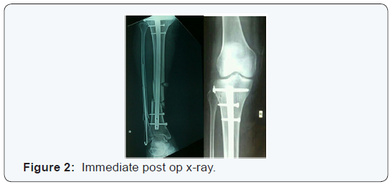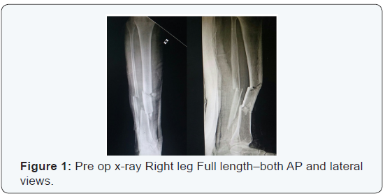 A 38 year old male presented to the casualty with history of RTA. He came to our institute with complaints of swelling of the right lower limb. There were no external wounds, but there were extensive grazed abrasions on the anterior aspect of right leg. His vitals were normal. No head injury or any other solid organ injury. Plain X-ray showed a Segmental fracture of both bone along with lateral condyle fracture of tibia (Figure 1). He was assessed for other co morbid conditions [4]. He was fit for the surgical procedure. He was taken up for surgery. Treated by closed reduction and internal fixation by using interlocking tibial nail. Fibula was fixed with a rush pin. Lateral condyle fracture of tibia was fixed with cannulated cancellous screw along with a washer. Post operative recovery was uneventful. Immediate post op x-ray showed a satisfactory reduction of fracture (Figure 2). Later he was put on non weight bearing of right leg for 6 weeks. Later x-ray was taken at 1 year post operative (Figure3).