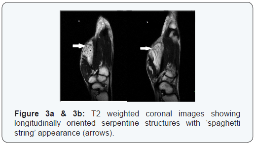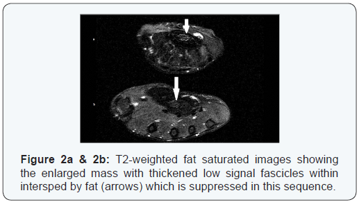 Fibrolipomatous hamartoma is a rare benign tumour affecting predominantly the median nerve. Pathognomonic MRI features of coaxial cable-like appearance on axial images or spaghetti shaped enlarged nerve fascicles and fibrous tissue should point to a definitive diagnosis [5,6]. Unnecessary biopsy can be avoided. The likelihood of the tumour growth to follow a branching pattern of the nerve and variation in distribution of mature fat within the lesion are additional features pointing towards the diagnosis of this entity.
