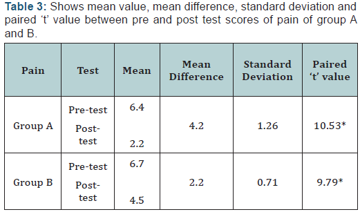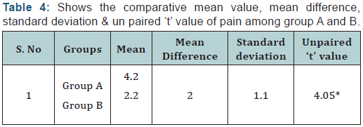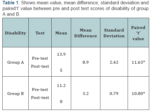 (Tables 1-4) In Group A, the calculated paired‘t’ value for disability and pain are 11.63 and 10.53 respectively at 0.05 level significance and the ‘t’ table value is 2.262, Hence the calculated ‘t’ values are more than ‘t’ table value, the study shows that there is significant difference in disability and pain following lumbar stabilization exercises among lumbar microdiscectomy patients. In Group B, the calculated paired ‘t’ value for disability and pain are 10.8 and 9.79 respectively at 0.05 level significance and the ‘t’ table value is 2.262, Hence the calculated ‘t’ values are more than ‘t’ table value, the above study shows that there is significant difference in disability and pain following progressive strengthening exercises among lumbar microdiscectomy patients.