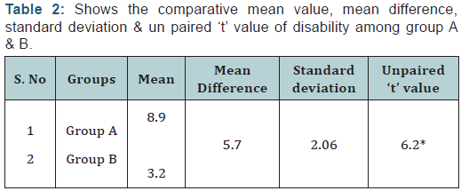 When analyzing the values of Group A and Group B by unpaired ‘t’ test, the calculated t’ value for disability and pain are 6.2 and 4.05 respectively at 0.05 level significance and the table ‘t’ value is 2.101, Hence the calculated ‘t’ value is more than ‘t’ table value, the above study shows that, there is significant difference between lumbar stabilization exercises and progressive strengthening exercises in reducing disability and pain among lumbar microdiscectomy patients. The mean difference value analysis of both the groups shows that there is more difference in disability and pain following lumbar stabilization exercises than progressive strengthening exercises in lumbar microdiscectomy patients.